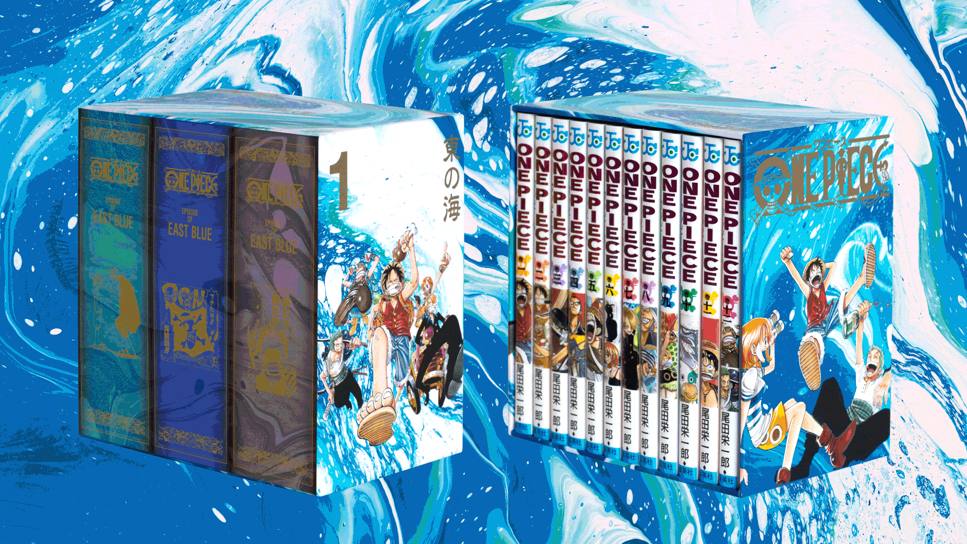 梅田 『ONE PIECE』の世界である青い星の「海」をそのまま再現すること、つまり「各巻を並べたときに海がひとつにつながることで、ルフィたちの冒険の舞台と軌跡を視覚化すること」をひとつのコンセプトとしています。各エピソードを構成する要素(舞台となる島、活躍するキャラクター、天候、そこで発生する事件など)を可能な限り抽出または解釈し、波模様として再構築することで、そのコンセプトを最大限に具現化できる、と考えました。